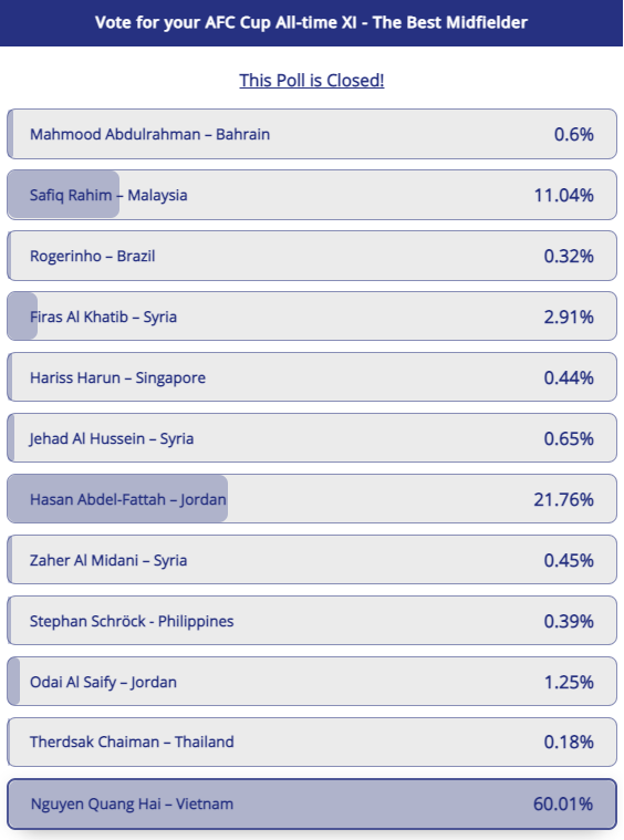 Kết quả bình chọn Tiền vệ xuất sắc nhất lịch sử AFC Cup
