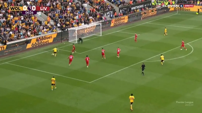 Bất ngờ đã xảy ra từ sớm trong cuộc đụng độ giữa Wolves và Liverpool. Phút thứ 7, xuất phát từ một đợt phản công nhanh, bóng được triển khai sang hành lang trái nơi Pedro Neto án ngữ.