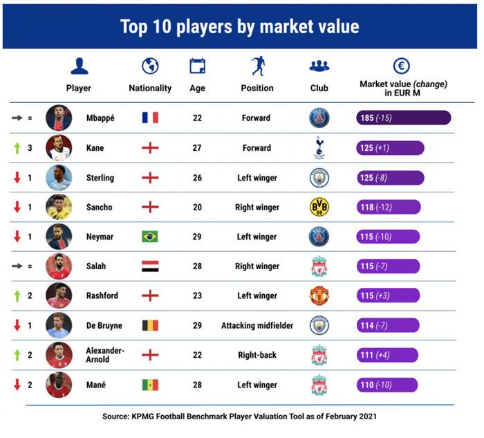 Trong Top 10 cầu thủ giá trị nhất thì Ngoại hạng Anh chiếm tới 7, bao gồm: Harry Kane, Raheem Sterling, Mohamed Salah, Marcus Rashford, Kevin de Bruyne, Trent Alexander-Arnold và Sadio Mane. 3 cầu thủ còn lại của Top 10 là Kylian Mbappe, Neymar Jr và Jadon Sancho.