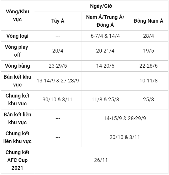 Cập nhật lịch thi đấu AFC Champions League và AFC Cup 2021 mới nhất với tâm điểm là các trận đấu của 3 đại diện bóng đá Việt Nam: Viettel, Hà Nội FC và Sài Gòn FC.