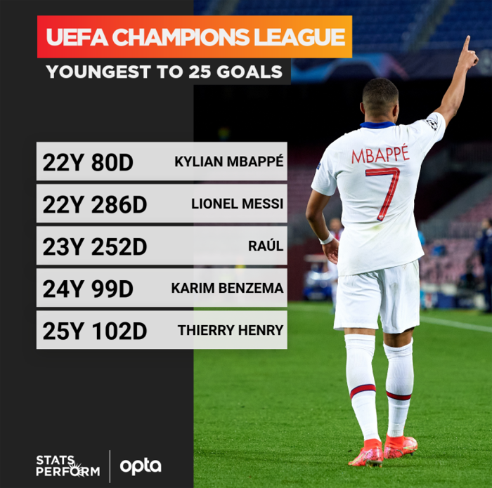 Cụ thể: Kylian Mbappe cán mốc 25 bàn tại Champions League ở 22 tuổi và 80 ngày. Trong khi đó, Messi có được 25 bàn đầu tiên tại Champions League ở 22 tuổi và 286 này. Xếp thứ 3 ở thống kê này là Raul Gonzalez: 23 tuổi và 252 ngày.
