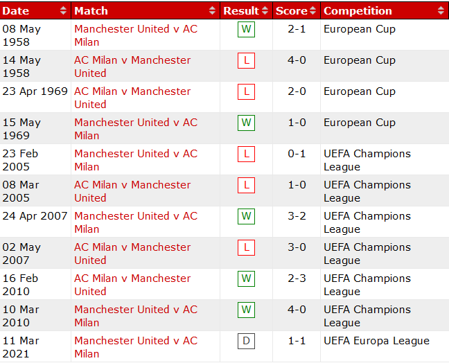 Tuy nhiên, ở lần gần nhất tiếp đón MU (tháng 2/2010), Rossoneri đã để thua với tỷ số 0-4. Wayne Rooney đã lập cú đúp trong trận đấu này.