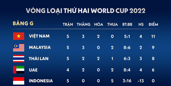ĐT Việt Nam đang dẫn đầu bảng G của vòng loại World Cup 2022 khu vực châu Á. Các cầu thủ do HLV Park Hang-seo dẫn dắt giành được 11 điểm sau 5 trận, hơn Malaysia 2 điểm và hơn Thái Lan 3 điểm.