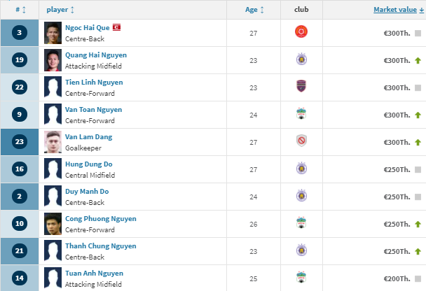 Định giá cầu thủ Việt Nam của Transfer Markt