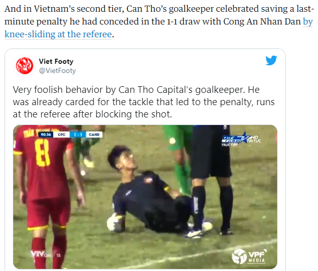 Tờ Guardian (Anh) đưa pha ăn mừng khiêu khích trọng tài của thủ môn Cần Thơ tại giải hạng nhất Việt Nam vào Top sự kiện nóng ngày 19/3.