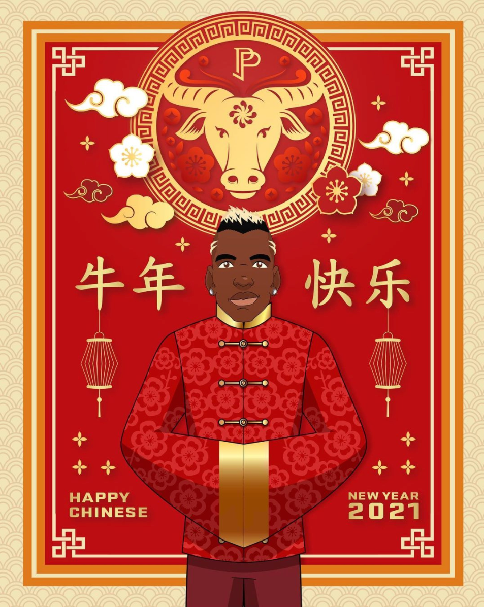 Dù không ăn Tết Âm lịch nhưng nhiều ngôi sao bóng đá vẫn không quên gửi lời chúc mừng đến người hâm mộ đang hân hoan trong ngày đầu năm Tân Sửu 2021. Tiền vệ Paul Pogba của MU nhận được nhiều sự yêu mến khi đăng tải hình ảnh và lời chúc năm mới vô cùng ý nghĩa trên trang cá nhân.
