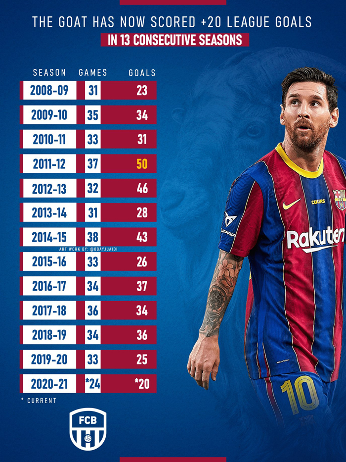 Cú đúp tại sân Camp Nou giúp Messi có được 21 bàn thắng kể từ khi La Liga 2020/21 khởi tranh. Anh trở thành cầu thủ đầu tiên trải qua 13 mùa giải liên tiếp thực hiện từ 20 pha lập công trở lên trong 1 mùa tại giải đấu này.