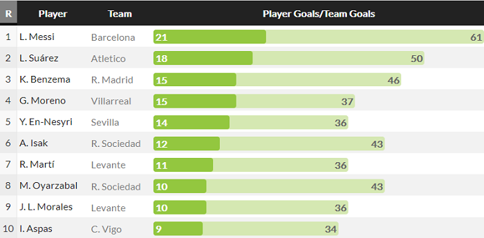 Messi tiếp tục dẫn đầu nhưng khoảng cách giữa anh và cầu thủ xếp liền sau là Luis Suarez đã được gia tăng lên thành 3 bàn. Số bàn thắng của Luis Suarez vẫn dừng lại ở con số 18 do anh không ghi bàn ở màn so tài trước đó giữa Atletico Madrid và Getafe.