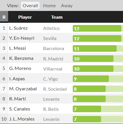 Xếp sau Messi trên bảng xếp hạng Top ghi bàn La Liga là Karim Benzema (Real Madrid) và Gerard Moreno (Villarreal). Benzema và Gerard Moreno cùng có được 10 pha lập công kể từ khi La Liga 2020/21 khởi tranh. Iago Aspas (Celta Vigo, 9 bàn) xếp ở vị trí thứ 6.