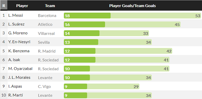 Xếp sau Lionel Messi và Luis trên bảng xếp hạng Top ghi bàn La Liga mùa này là Gerard Moreno. Cầu thủ thuộc biên chế CLB Villarreal đã có 14 pha lập công. Gerard Moreno có nhiều hơn 1 bàn so với Youssef En-Nesyri (Sevilla).