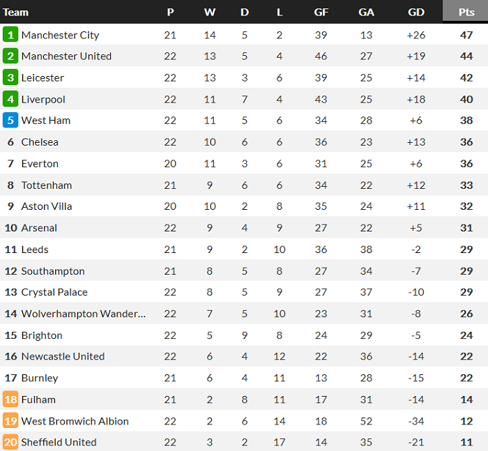 Bảng xếp hạng Ngoại hạng Anh 2020/21 sau vòng 22