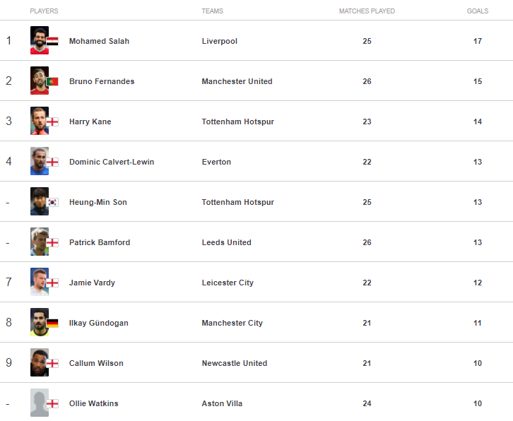 Mùa giải này, Salah vẫn là chân sút tốt nhất của Liverpool. Ngôi sao sinh năm 1992 đã ghi được 17 bàn thắng cho The Kop tại Premier League 2020/21, dẫn đầu danh sách Vua phá lưới với 2 bàn nhiều hơn người xếp thứ hai Bruno Fernandes (MU).