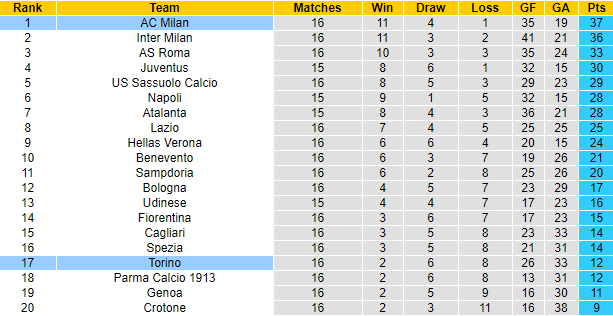Bên kia chiến tuyến, Torino sau 16 trận tại Serie A mùa này mới giành được 12 điểm, xếp ở vị trí thứ 17 trên bảng xếp hạng.
