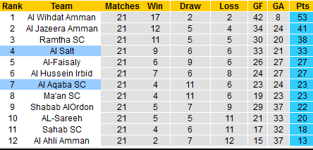Cho đến trước khi mùa giải còn 1 vòng đấu cuối, Al Aqaba đứng thứ 7 với 23 điểm sau 21 vòng, ít hơn tới 4 điểm so với vị trí thứ 6. Bên kia chiến tuyến, Al Salt đứng thứ 4 với 33 điểm nhưng cũng bị Top 3 bỏ xa tới 5 điểm.
