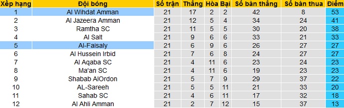 Bảng xếp hạng giải VĐQG Jordan trước vòng 22