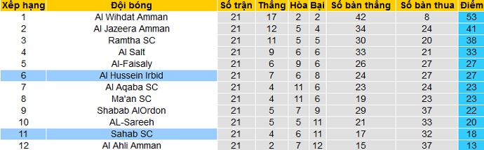 Bảng xếp hạng giải VĐQG Jordan trước vòng 22
