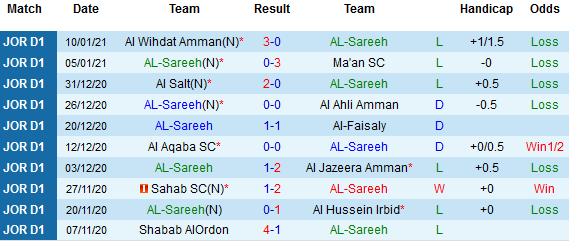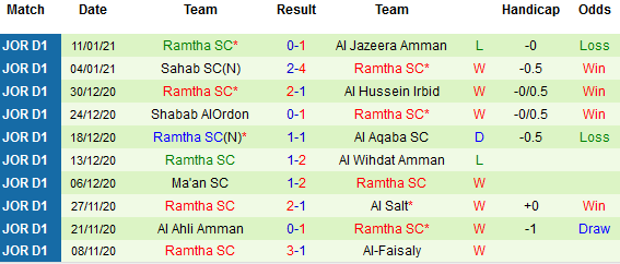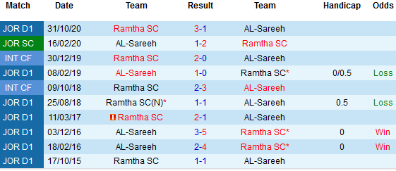 Trong 3 lần gặp nhau gần nhất ở các giải đấu khác nhau, Ramtha đều giành chiến thắng và ghi được ít nhất 2 bàn. Ở thời điểm hiện tại cũng không nhiều cơ hội để Al Sareeh tạo ra kết quả khác biệt.