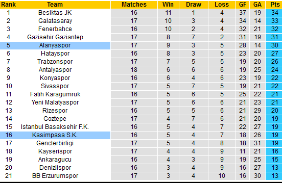 Ở chiều ngược lại, Kasımpasa thậm chí đang phải đối mặt với nguy cơ rớt hạng. Đội khách chỉ đứng thứ 16 với 3 điểm nhiều hơn vị trí phải xuống hạng. Sự khác biệt rõ ràng đã nghiêng về Alanyaspor.