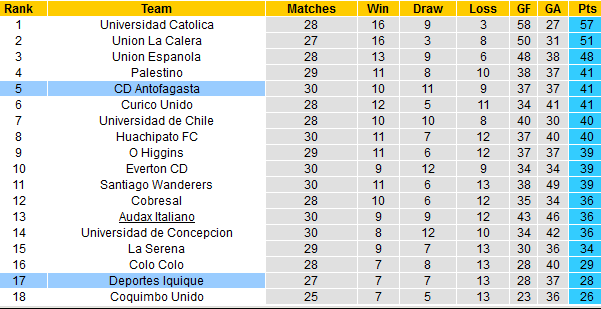 Nếu như Deportes Iquique đang chạy đua với thời gian khi đang đứng áp chót bảng điểm và cũng chỉ hơn đội bét bảng đúng 2 điểm. Nếu không sớm cải thiện phong độ, đội khách đối diện với nguy cơ xuống chơi tại giải Hạng 2.