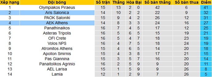 Trong khi đó AEK Athens đang đứng thứ tư trên bảng xếp hạng với 30 điểm cũng sau 15 vòng đấu, kém hơn đôi chút so với vị trí thứ ba ở mùa giải năm ngoái. Đáng nói là AEK Athens đang hơn các đội nằm ngoài Top 6 tới 11 điểm.