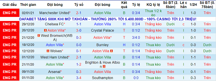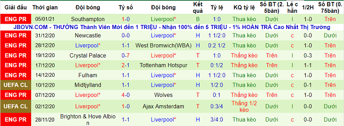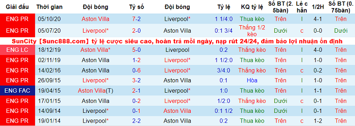 Ở lần so tài gần nhất (vào tháng 10/2020), Liverpool chấp Aston Villa với tỷ lệ 1 1/4:0. Kết quả: Liverpool thua 2-7 và thua luôn kèo. Lần tái đấu này, Liverpool vẫn ở thế ‘cửa trên’ nhưng tỷ lệ chấp chỉ còn 1/4:0.