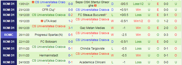+ Thống kê 10 trận gần nhất của Universitatea Craiova