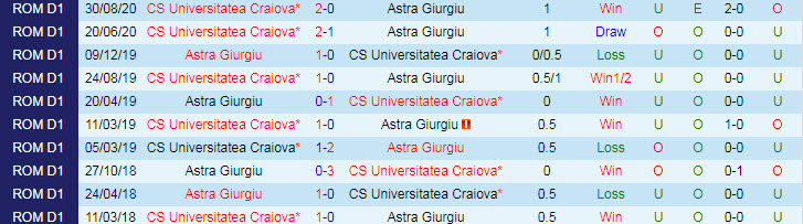 Phong độ và thống kê đối đầu Astra Giurgiu - Universitatea Craiova gần đây: