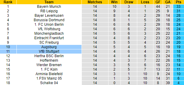 Augsburg có thành tích đối đầu thuận lợi trước Stuttgart. Trong vòng 11 lần chạm trán Stutgart trước đó tại giải VĐQG Đức, Augsburg thắng 8, hòa 1 và chỉ để thua 2 trận. Sau 14 vòng đấu tại Bundesliga 2020/21, Augsburg giành 19 điểm, hơn Stuttgart 1 điểm. Thế nhưng trận đối đầu sắp tới, dù được chơi trên sân nhà, Augsburg vẫn phải xếp chiếu dưới.