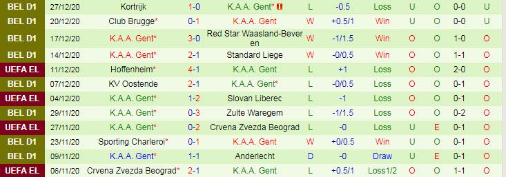 + Thống kê 10 trận gần nhất của KAA Gent
