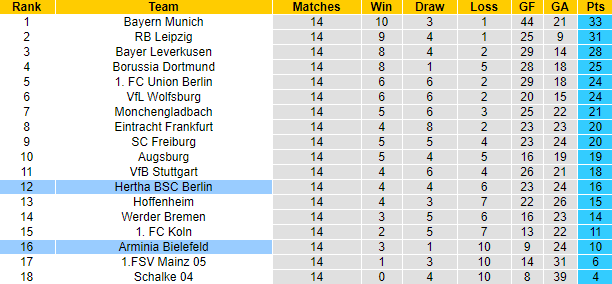 Đội khách Hertha Berlin đang xếp thứ 12 trên bảng xếp hạng với 16 điểm sau 14 trận. Đối đầu Bielefeld 5 trận gần đây Hertha Berlin bất bại với 4 chiến thắng và 1 trận hòa. Tuy nhiên ở trận đấu sắp tới Hertha Berlin lại bị nghi ngờ vào khả năng giành chiến thắng khi liên tục gây thất vọng trên sân khách. 13 trận xa nhà trước đó tính trên mọi đấu trường, Hertha Berlin thua 9, hòa 2 và chỉ thắng được 2 trận.