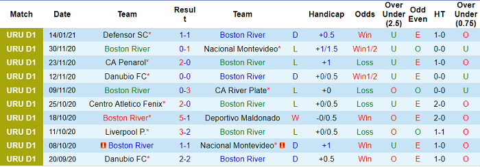Kể từ khi giải VĐQG Uruguay mùa 2020 khởi tranh, Boston River chỉ thắng được 3 trận. Nhưng 2 trong số 3 chiến thắng đó của Boston River diễn ra trước Deportivo Maldonado. Có thể coi Deportivo Maldonado là đối thủ mà Boston River thực sự yêu thích.