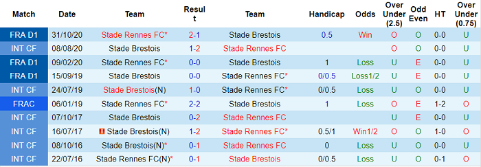 Phong độ và thống kê đối đầu Brest - Rennes gần đây