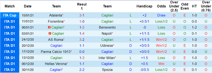Phong độ và thống kê đối đầu Cagliari gần đây