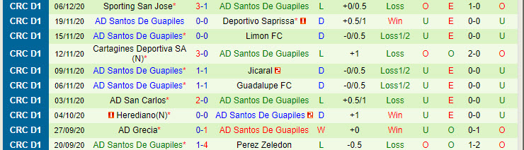 + Thống kê 10 trận gần nhất của Santos Guapiles
