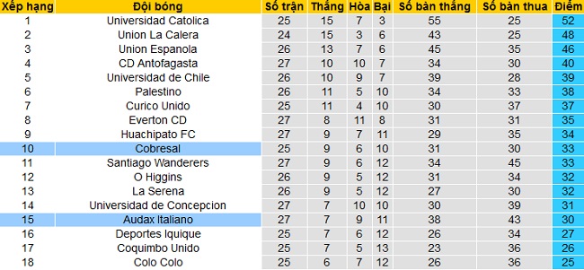 Bảng xếp hạng giải VĐQG Chile trước vòng 28