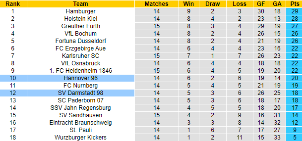 Darmstadt có nhiều nỗi lo về lực lượng, danh sách chấn thương của họ lên tới 4 trụ cột. Bên kia chiến tuyến, Hannover lúc này lại đang rất tự tin với đội hình và phong độ vào phom. 3 trận gần đây trong khuôn khổ giải hạng 2 Đức, Hannover thắng 2, hòa 1, ghi 6 bàn và không để thủng lưới lần nào. Trên sân khách 3 trận vừa qua, Hannover cũng chỉ phải nhận 1 bàn thua.