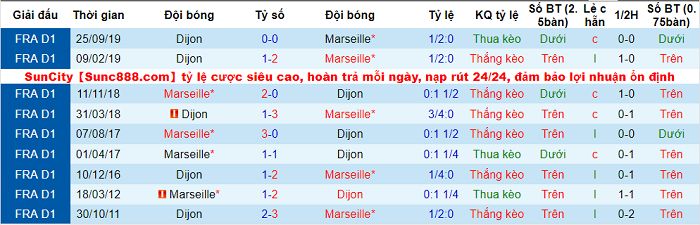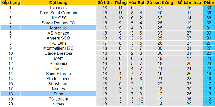 5 trận sân nhà gần đây, Dijon thậm chí không ghi nổi lấy 1 bàn thắng. 2 trận sân nhà gần nhất, Dijon đều phải nhận thất bại: 0-2 trước Lille và 0-1 trước Monaco. Họ khó tránh khỏi thất bại vào rạng sáng Chủ nhật (10/11) theo giờ Việt Nam bởi Marseille sở hữu trình độ cao hơn đáng kể.