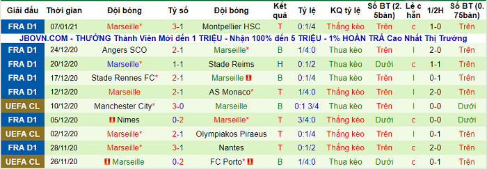 Trên sân khách, tỷ lệ thắng kèo của Marseille thậm chí còn ấn tượng hơn. Tỷ lệ thắng kèo trên sân khách của Marseille tại Ligue 1 mùa này lên tới 75%, chỉ sau Metz và Angers (cùng 77.78%). Vì vậy, lựa chọn Marseille tương đối an toàn đối với giới đầu tư.