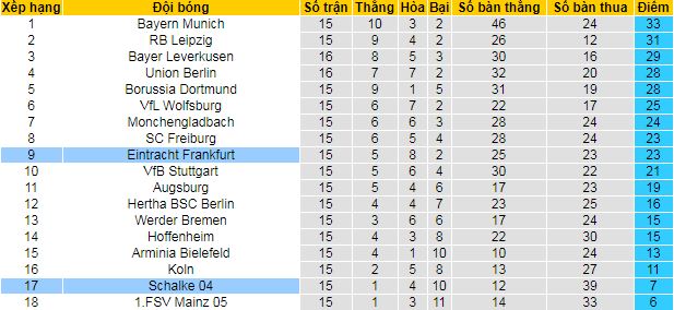 Thành tích trên sân khách của Schalke vẫn luôn rất tệ hại. Đội bóng này đã để thua đến 5 trận và chỉ có 2 trận hòa sau 7 trận sân khách mùa này. Lịch sử đối đầu cũng đang nghiêng về đội chủ nhà khi Eintracht Frankfurt có 6 chiến thắng và 2 thất bại trong 10 lần gần nhất hai đội chạm trán nhau.