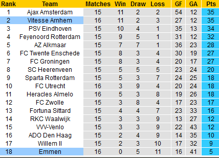 Với tương quan yếu kém của Emmen, Vitesse Arnhem được đánh giá sẽ không mấy khó khăn để giành chiến thắng. Đội khách đang trong khoảng thời gian thực sự đáng nhớ khi đang xếp nhì bảng, bằng điểm với Ajax nhưng chỉ kém về chỉ số phụ và đá nhiều hơn 1 trận.
