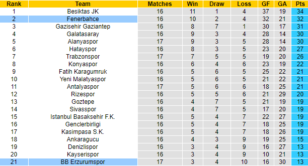 Sau 17 vòng đấu tại Super Lig 2020/21, Erzurum BB mới giành được 13 điểm, xếp ở vị trí đội sổ trên bảng xếp hạng. Trong khi đó Fenerbahce đã giành được 32 điểm sau 16 trận, xếp ở vị trí thứ 2. Chỉ kém đội đầu bảng Besiktas 2 điểm, Fenerbahce càng có thêm quyết tâm để hướng tới 3 điểm trọn vẹn ở trận đấu sắp tới.