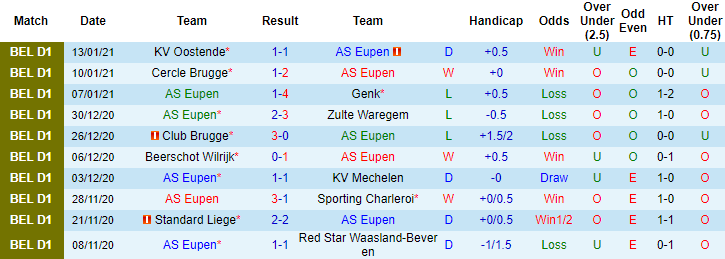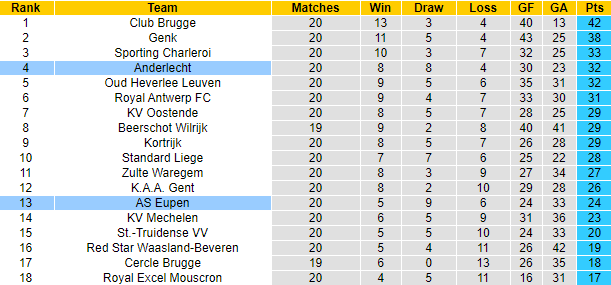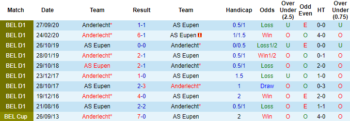 Anderlecht luôn được đánh giá cao hơn Eupen ở các cuộc đối đầu. Nhưng 5 lần làm khách trước đó trên sân của Eupen, Anderlecht chỉ thắng được 1 trận, còn lại là 3 trận hòa và 3 thất bại. Tính theo kèo châu Á Eupen thắng 4, hòa 1 trong 5 trận đấu này. Giai đoạn gần đây Eupen cho thấy phong độ khởi sắc, 2 trận vừa qua họ thắng 1, hòa 1 và toàn thắng theo kèo châu Á.