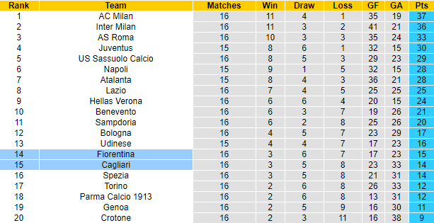 5 trận sân nhà vừa qua trong khuôn khổ Serie A, Fiorentina cũng không biết đến mùi chiến thắng (thua 1, hòa 4). Tuy nhiên ở trận đấu sắp tới với Cagliari, Fiorentina lại mang đến nhiều hứa hẹn vào khả năng phá dớp.