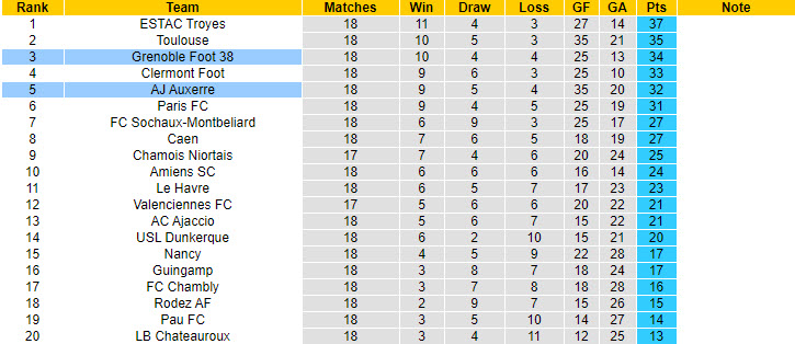 Grenoble và Auxerre đang có thứ hạng cao trên bảng xếp hạng giải hạng 2 Pháp. Cụ thể, họ lần lượt xếp ở các vị trí thứ 3 và 5 trên BXH, và đây là những vị trí được đá play off thăng hạng.