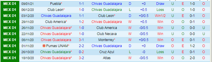+ Thống kê 10 trận gần nhất của Guadalajara Chivas