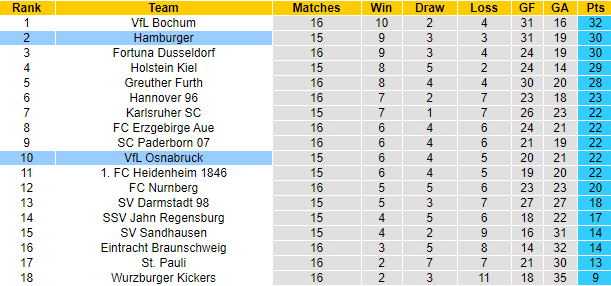 Hamburger đang xếp thứ 2 trên bảng xếp hạng giải hạng 2 Đức với 30 điểm sau 15 trận, kém đội đầu bảng Bochum 2 điểm nhưng đá ít hơn 1 trận. Nếu đánh bại Osnabruck trong 90 phút sắp tới, Hamburger sẽ đòi lại được vị trí số 1 vốn thuộc về họ ở những vòng đấu vừa qua.