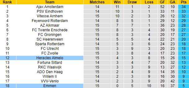 Heracles Almelo toàn thắng cả 6 trận tiếp đón Emmen gần đây trên sân nhà Erve Asito. Emmen ở mùa giải này đang được coi là "kho điểm" của các đội bóng tại giải VĐQG Hà Lan. Sau 15 trận Emmen mới giành được 5 điểm, xếp dưới đáy bảng xếp hạng.