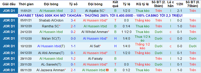 Hussein Irbid thời gian qua không có được thành tích tốt trên sân nhà. Họ không thắng cả 7 trận sân nhà gần nhất thuộc khuôn khổ giải VĐQG Jordan. Trong chuỗi 7 trận không thắng trên sân nhà vừa rồi, Hussein Irbid hòa 3 và thua 4.