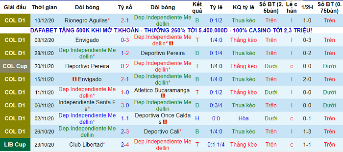 - Thống kê 10 trận gần nhất của Independiente Medellin