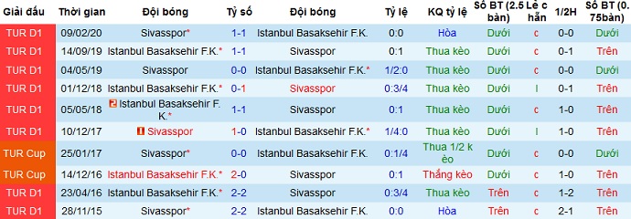 + Soi tỷ lệ kèo châu Á: Với việc được chơi trên sân nhà cùng với phong độ đang lên nên Istanbul Basaksehir được đánh giá là đội cửa trên với kèo -0,5. Thế nhưng ở 5 lần chạm trán gần nhất Sivasspor vẫn đang bất bại trước đối thủ với 1 trận thắng và 4 trận hòa. Thế nên lựa chọn cửa dưới trong trận này sẽ là sự lựa chọn khá hợp lý.